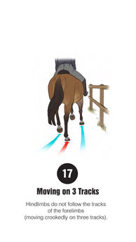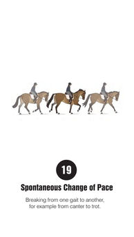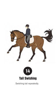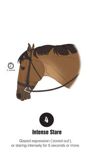 The assessor should watch the video above that explains the behaviours you are looking out for (also available in picture form to view on your mobile below). The assessor should stand in two corners of the school (or area your working in) to see the horse in both directions from the side, head on and away. Having the checklist to hand (download below), any behaviours under the specifications described should be marked when observed. After 10 minutes or when the horse has been viewed in all three paces in both directions, the score can be calculated by simply adding up the checked points observed during the assessment.